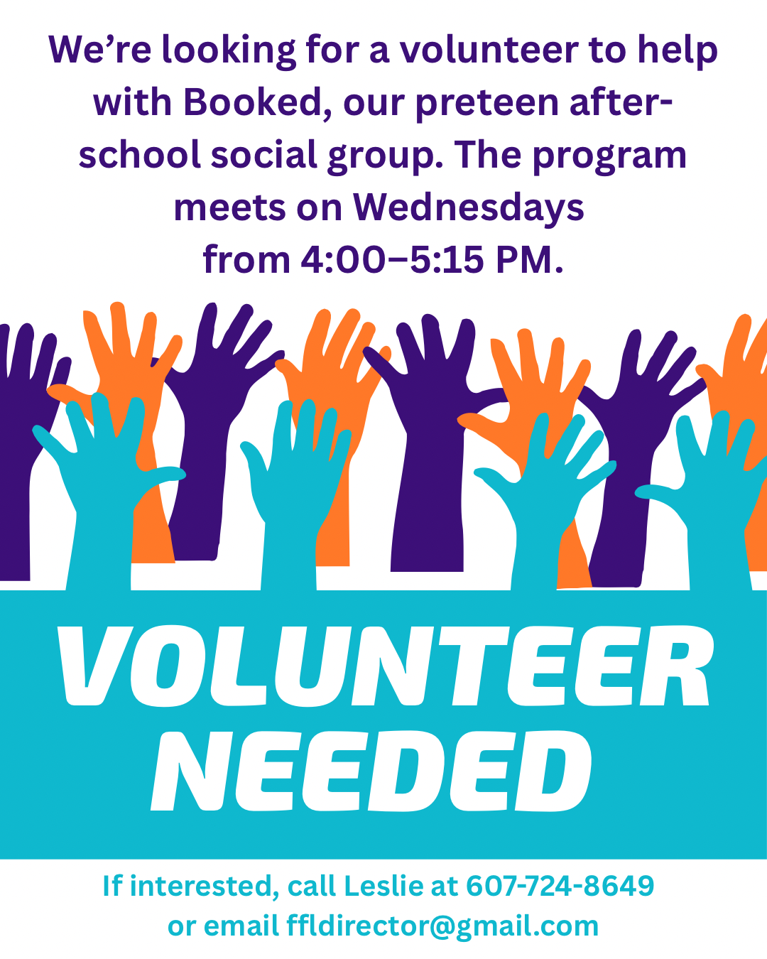 We're looking for help with our Booked program. See the flier on the back of this window and if interested, give us a call.